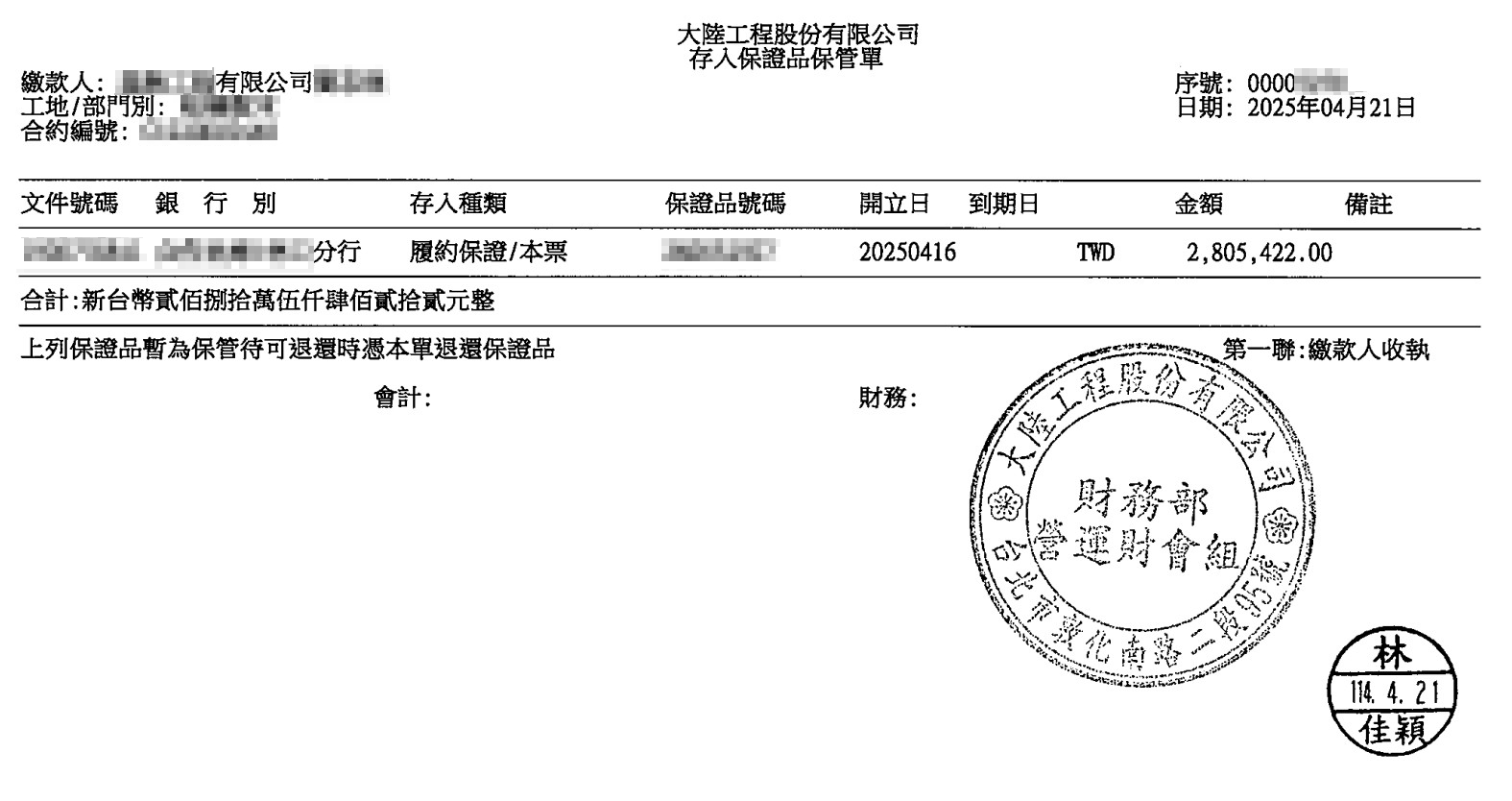 本公司財部單位收到履保品後,將會開立保管單並隨用印完成的合約正本一同寄回廠商。該保管單為後續辦理退回履保品之重要文件,遺失不補發,請妥善保管。